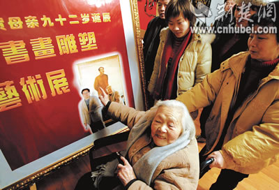 “這是特意為您準(zhǔn)備的生日禮物!”年過六旬的盧永瀚攙扶著92歲的母親,在根雕、油畫面前仔細(xì)講解!斑@個(gè)根雕是壽字!”孫女插話說(shuō):“就是祝您長(zhǎng)壽,活過100歲!”慧老太太邊看邊比劃著,樂得合不攏嘴,用濃重的江浙口音說(shuō):“好、好!”