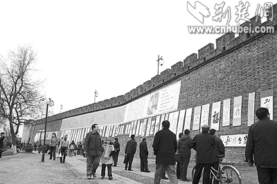 荊楚網(wǎng)(楚天都市報)(記者釋喻 攝)前日上午,襄樊西門橋古城墻上舉辦了一場別開生面的書法展,近百幅作品被懸掛在城墻上,向市民免費展出,展覽為期7天。此次活動由襄樊市文聯(lián)等單位舉辦,展出的是書法家王樹人先生的遺作和其傳人的近期作品;顒蝇F(xiàn)場還進行了書法義賣,所得款項將用于襄樊歷史文化名城的保護和宣傳工作。