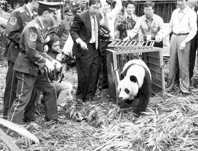 荊楚網(wǎng)消息(楚天都市報)一只野生大熊貓日前闖入四川省都江堰鬧市(本報曾予報道),被當(dāng)?shù)亓謽I(yè)部門營救,并被送往臥龍自然保護(hù)區(qū)療養(yǎng)。8月8日,戴有GPS衛(wèi)星定位儀器的大熊貓被放歸都江堰龍溪虹口國家自然保護(hù)區(qū)。當(dāng)天,它沒說拜拜就踏出鐵籠走入密林,前后不到10秒鐘?蒲腥藛T在今后一年多的時間內(nèi),將對它進(jìn)行定位跟蹤,這有助于科學(xué)家進(jìn)一步了解和掌握大熊貓野外生活習(xí)性和活動規(guī)律。(新華社發(fā))