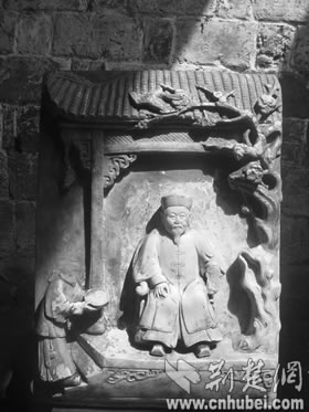 當(dāng)日,記者在該鎮(zhèn)八角亭村劉貴灣見到了這尊雕像。神龕下面,一村民小心翼翼地抱下一塊40余厘米高,30余厘米寬,10余厘米厚的“石頭”,上面布滿灰塵,一位村民虔誠地為這位“太公”“洗了個澡”,一幅人物情景雕像出現(xiàn)在人們面前(如右圖):一位富態(tài)老年男子端坐太師椅,男子右側(cè)前方有一人托盤而立,盤子中間放著茶壺(此人頭部和茶壺都破碎不存),男子左前方則雕有一盆臘梅,直到屋頂,梅花和喜鵲栩栩如生,青磚碧瓦,歷歷在目,而富態(tài)男子就連胡須的“紋路”都雕了出來,雙目傳神。