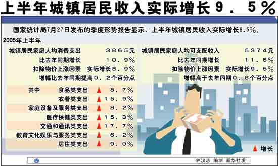 國家統(tǒng)計(jì)局進(jìn)行的抽樣調(diào)查顯示,上半年城鎮(zhèn)居民家庭人均可支配收入為5374元,比去年同期增長(zhǎng)11.6%,扣除物價(jià)上漲因素,實(shí)際增長(zhǎng)9.5%,增幅高于去年同期0.8?jìng)(gè)百分點(diǎn)。