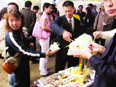 這個(gè)匠心獨(dú)運(yùn)的蛋糕由妞妞公司制作贈(zèng)送。其主體部分是一條飛龍,并書(shū)有“飛龍?jiān)谔臁弊謽印ow龍一側(cè),則是一只“神舟六號(hào)”航天飛船模型。