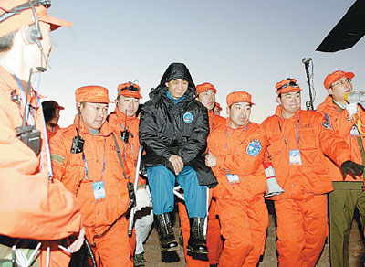 5分鐘后,兩名航天員在工作人員的簇?fù)硐,進(jìn)入著陸點(diǎn)100米開外的一架直升機(jī)內(nèi)全面體檢,工作人員和群眾在外焦急地等待最后的檢查結(jié)果。