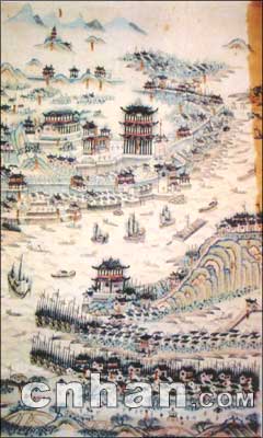 此圖藏于大連市圖書館,手繪彩圖。未標(biāo)明作者姓名和成圖時間,圖中標(biāo)注了武昌、漢口“龍王廟”等。筆者鑒定此圖為清代中期作品,根據(jù)是圖中有“龍王廟”,而龍王齋建于乾隆四年(1739年),故此圖當(dāng)于1739年以后所繪。但圖中沒有出現(xiàn)漢口城堡,而漢口城堡建于1864年,同時圖中只繪有木帆船,而未出現(xiàn)現(xiàn)近代輪船。武漢江面出現(xiàn)航運和輪船是1862年以后?芍藞D當(dāng)成于1862年前。可大體界定此圖繪于1739年至1862年之間。