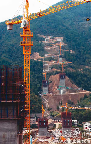 龍?zhí)逗犹卮髽蚓o鄰長陽縣榔坪鎮(zhèn),是滬蓉西高速公路上一座T構(gòu)箱梁橋,主橋墩最高178米,居世界同類橋高墩之最!耙娺^這么高的塔吊沒?”戴上安全帽,湖北路橋公司項(xiàng)目經(jīng)理夏君華帶記者一行踏訪工地。