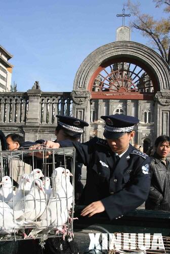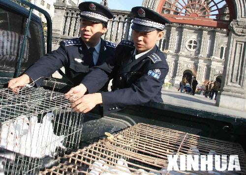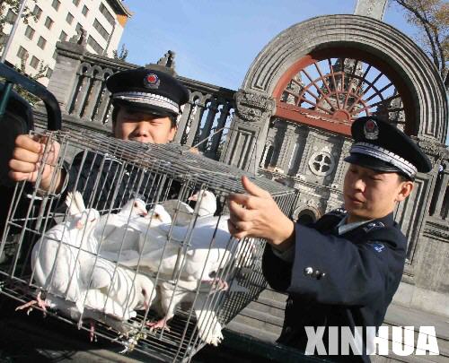 11月15日,北京市東城區(qū)城管隊員在王府井教堂的廣場前拉起一張捕鳥網(wǎng),捕捉廣場附近的野鴿子。這些野鴿子將被送到信鴿協(xié)會在昌平設立的鴿舍,待禽流感疫情解除后,再放回廣場。 新華社發(fā)(吳強 攝)