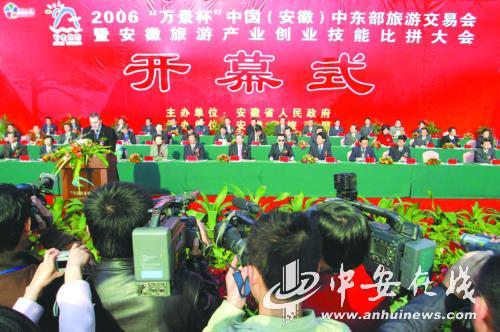 旅游盛會迎嘉賓,皖風(fēng)徽韻放異彩。12月1日,由省政府主辦、省旅游局承辦的“2006中國(安徽)中東部旅游交易會暨安徽旅游產(chǎn)業(yè)創(chuàng)業(yè)技能比拼大會”在合肥國際會展中心隆重開幕。省委書記郭金龍宣布大會開幕,省長王金山在開幕式上致辭。副省長文海英主持開幕式。