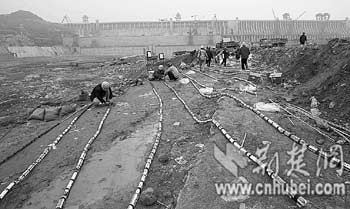 2月27日下午,雨霧中的爆破現(xiàn)場(chǎng)一片寂靜。6條長(zhǎng)90米、直徑0.6米的吸水鋼管已停止向圍堰基坑內(nèi)充水。基坑內(nèi),一泓江水微波蕩漾。