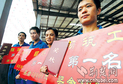 荊楚網(wǎng)(楚天都市報(bào)) 記者 黃宏 劉中燦 通訊員 鄒清選 熊煥武 攝 全省首屆建筑業(yè)技能大賽昨日落下帷幕,梁平泉、殷雄、蘇洪生、陶猛4位農(nóng)民工從省領(lǐng)導(dǎo)手中接過一等獎的獲獎證書,喜當(dāng)技能狀元,當(dāng)場各獲獎金1萬元。