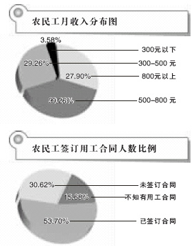 被調(diào)查農(nóng)民工的月工資主要集中在500至800元之間。其中,每月收入在300元以下的占3.58%,300至500元的占29.26%,500至800元的占39.26%,800元以上的占27.90%。