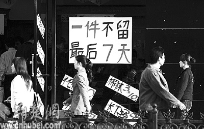 昨日,武漢市江漢路某品牌商店用碩大的“褲”字吸引行人購(gòu)買(mǎi)欲(圖一)。在市場(chǎng)競(jìng)爭(zhēng)激烈的今天,“臉面”設(shè)計(jì)成為商家費(fèi)勁腦筋追逐的重心,但也有一些商家長(zhǎng)期打著“大甩賣(mài)”的旗號(hào)欺騙消費(fèi)者,頗煞風(fēng)景(圖二)。記者 張鴻 攝