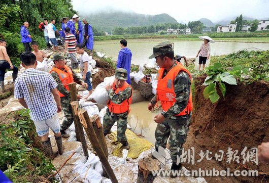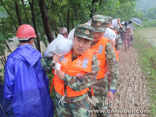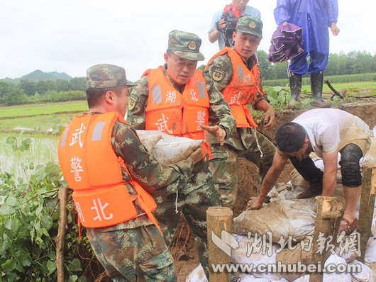災(zāi)情就是命令,武警湖北總隊(duì)咸寧支隊(duì)立即啟動(dòng)應(yīng)急機(jī)制,按預(yù)案迅速出動(dòng)官兵20余名,攜帶救生繩、救生圈、編織袋、鐵鍬、洋鎬等工具第一時(shí)間奔赴現(xiàn)場(chǎng),擔(dān)負(fù)裝填沙袋和筑堤任務(wù)。