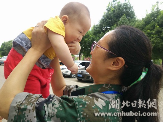 湖北日?qǐng)?bào)網(wǎng)訊(全媒體記者 張愛虎 通訊員 江開群 秦修)6日上午8時(shí)30分,嘉魚縣陸溪鎮(zhèn)鎮(zhèn)長(zhǎng)路紅云,到縣防指辦理防汛物資報(bào)領(lǐng)手續(xù),忙完后下樓,正是9時(shí)10分,見到婆婆抱著5個(gè)多月的兒子蕗熙趕來。乘著采訪的間隙,一身戎裝、皮膚黧黑的路紅云抱著兒子逗玩。