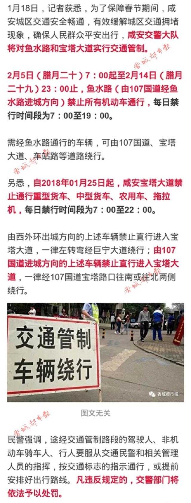 18日悉,為保障春節(jié)期間,咸安城區(qū)交通安全暢通,咸安交警大隊將對魚水路和寶塔大道實行交通管制。途經(jīng)交通管制路段的駕駛?cè)?、行人要服從交通民警和相關(guān)管理人員的指揮,按交通標(biāo)志的指示通行。凡違反規(guī)定的,將依法處罰。具體路段