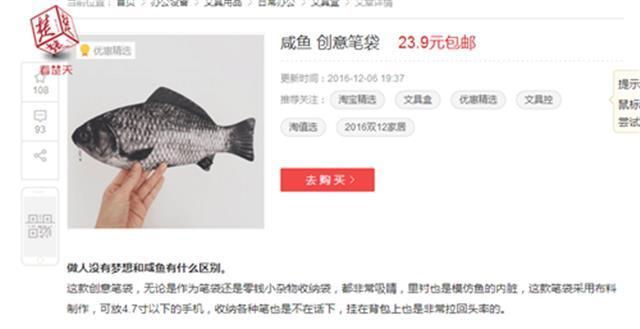 據(jù)了解,“咸魚”筆袋的主人是個初一孩子,記者聯(lián)系他的媽媽后得知,筆袋是孩子在網(wǎng)上挑選后,她購買的。“不知道他為什么喜歡這個筆袋?!笔潞?,記者在淘寶、京東上搜索“咸魚筆袋”后,也確實發(fā)現(xiàn)了類似的筆袋。