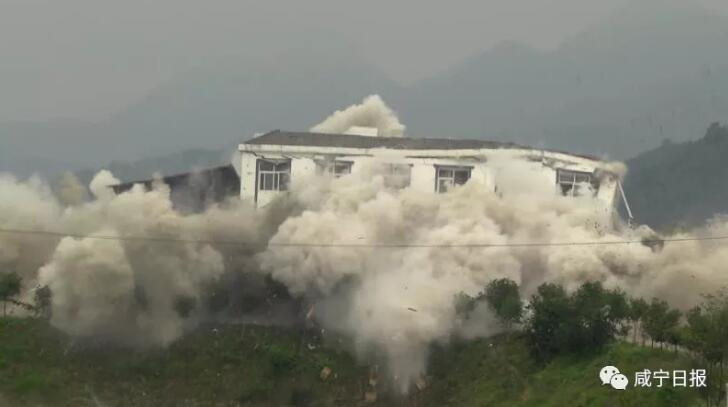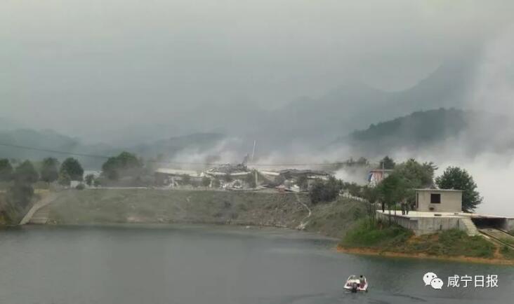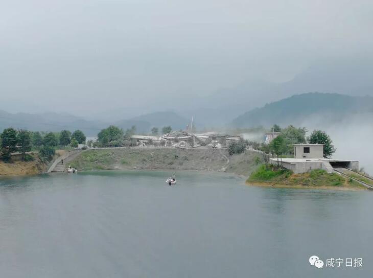 6月2日上午10:30整,隨著“轟”的一聲巨響,崇陽(yáng)縣青山水庫(kù)里的孤島上,一座白色建筑物瞬間坍塌成為廢墟。