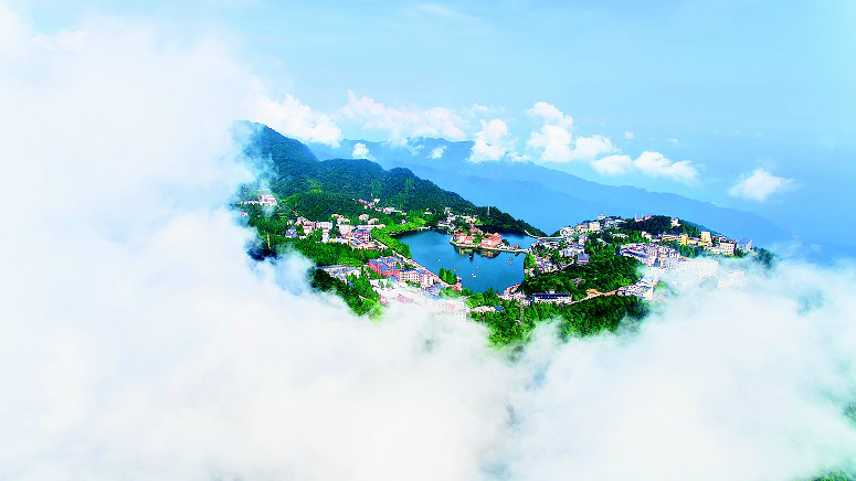 8月4日,空中鳥瞰通山縣九宮山國家級風(fēng)景名勝區(qū),山頂?shù)脑浦泻ㄈ灰恍隆?/p>