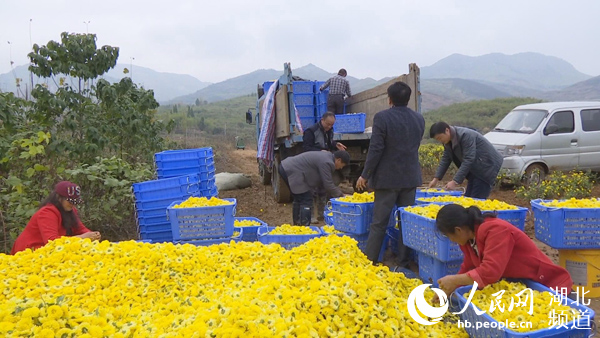 人民網(wǎng)通山11月15日電 深秋十一月,是秋菊的最佳采摘季節(jié)。近日,湖北通山縣燕廈鄉(xiāng)湖畔村和尚頭貢菊種植基地,那金黃色的花兒,忍不住秋天的誘惑競(jìng)相開放。放眼望去,幾十位村民正在緊張忙碌采摘金黃的貢菊,田里一片繁忙的景象。