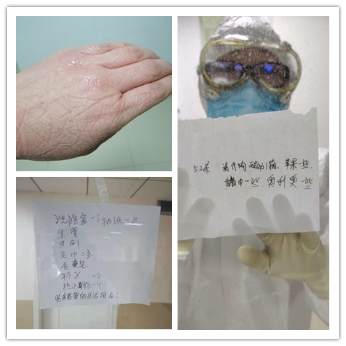 他們負責(zé)隔離患者的日常治療和護理,每天6個小時一次的輪班,穿上隔離服,她們就進入緊張而有序的工作狀態(tài)。因為穿、脫隔離服有著嚴格的操作流程和要求,所以不能夠喝水,穿著隔離服不方便上廁所。每天她們要做多種檢測和病情的記錄,身心處于高度戒備狀態(tài)的同時,還必須時刻密切關(guān)注病患的心理變化,安撫病患的情緒。