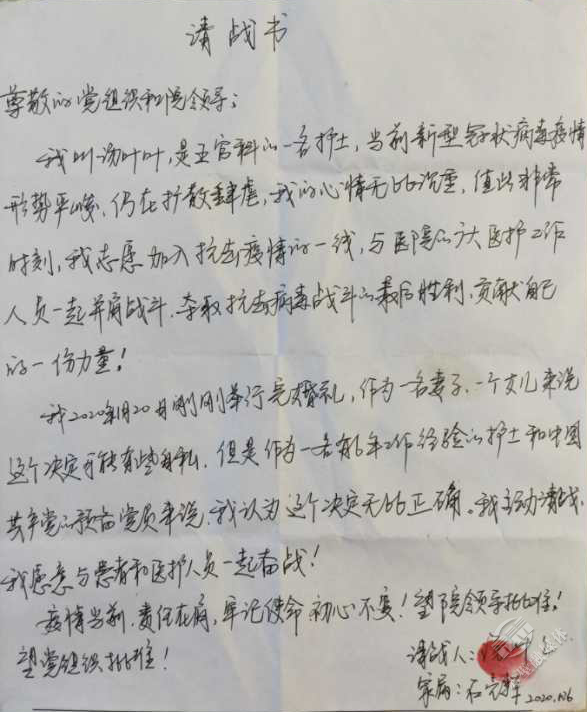 剛剛新婚,主動(dòng)放棄婚假,遞交請(qǐng)戰(zhàn)書,請(qǐng)求奔赴抗疫前線,貢獻(xiàn)自己的一份力。市人民醫(yī)院預(yù)備黨員、護(hù)士湯葉葉在請(qǐng)戰(zhàn)書中這樣寫道:“疫情當(dāng)前,責(zé)任在肩,牢記使命,初心不變!”