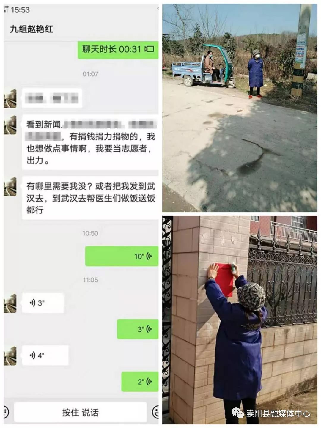 “有哪里需要我嗎?我要當(dāng)志愿者,哪怕是到武漢去為醫(yī)生做飯送飯都行?!边@是青山鎮(zhèn)城萬村九組村民趙艷紅2月2日凌晨1點(diǎn),向村婦聯(lián)主席發(fā)出的“請(qǐng)戰(zhàn)”信息。
