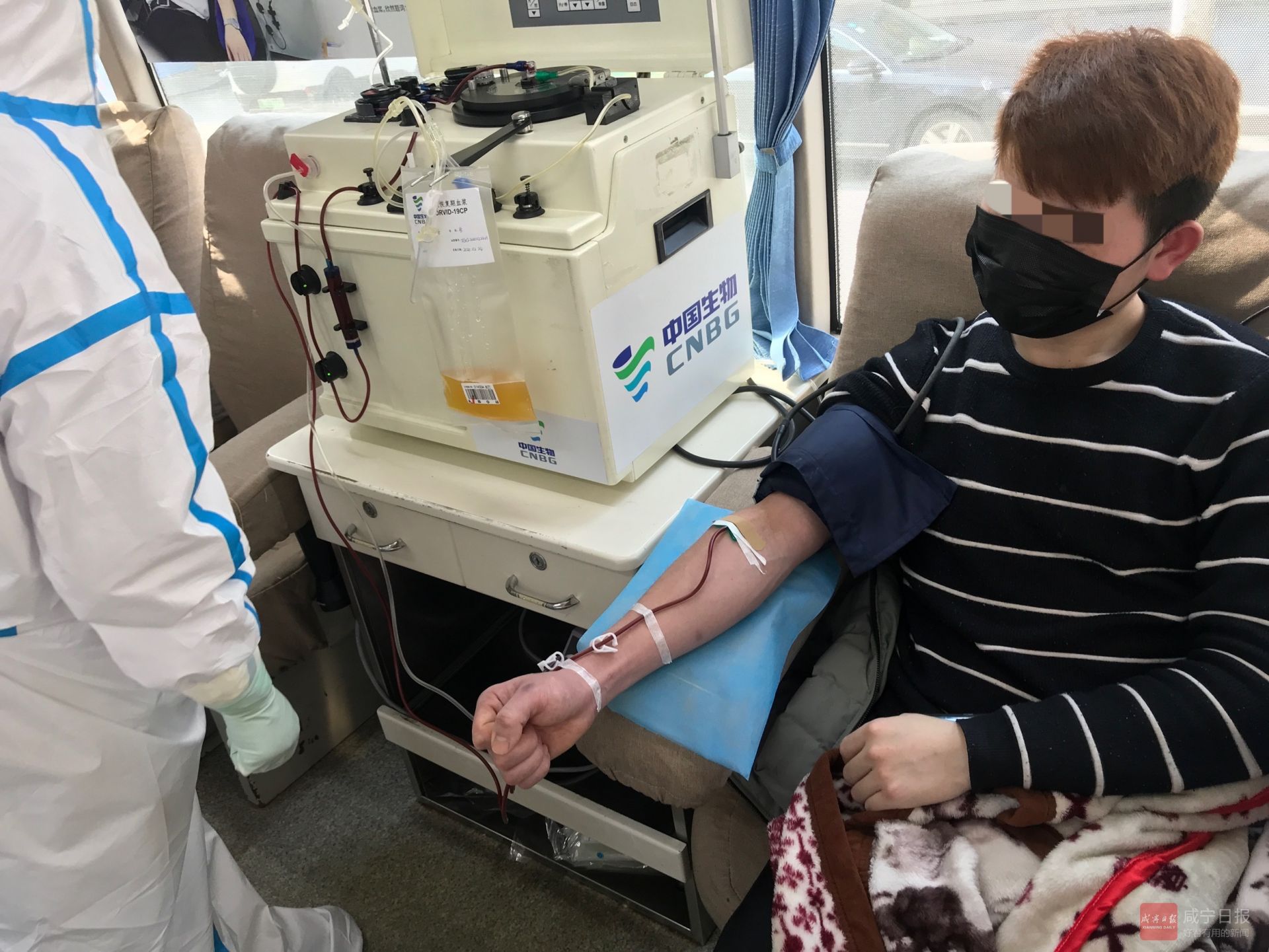 當(dāng)天,治愈患者程某在經(jīng)過(guò)CT、核酸檢測(cè)、體檢征詢等一系列操作后,在咸寧市中心血站流動(dòng)采血車上接受了血漿采集,共400毫升。