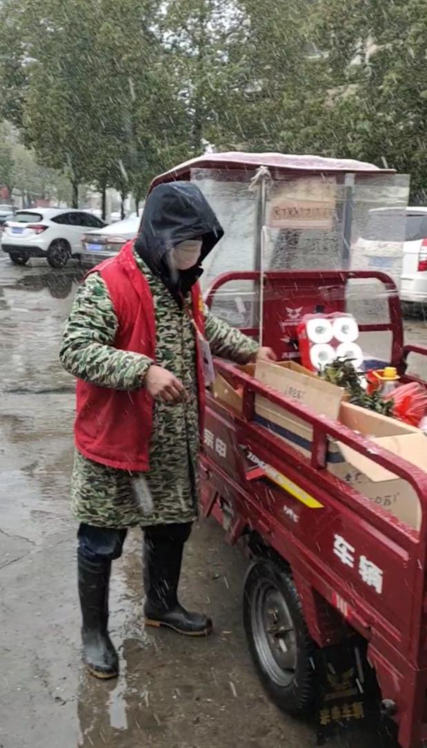 何正武負(fù)責(zé)整個小區(qū)生活保障物資配送、廣播宣傳巡查、樓棟排查。15日,他為20多戶居民送來訂購的菜,風(fēng)雪中,他在門衛(wèi)足足等了兩個多小時,最后只等來了三位居民前來拿走預(yù)訂的菜。盡管如此,他還是一如既往,做好物資配送等各項工作。
