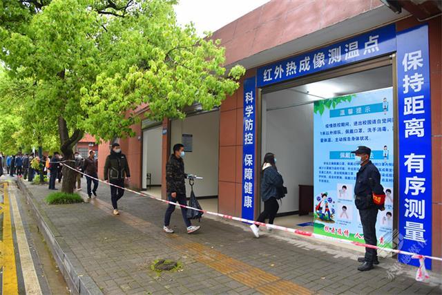 演練圍繞學校開學后,師生進入校園“如何進行體溫檢測”、“發(fā)現(xiàn)發(fā)熱學生如何進行應(yīng)急處置”展開。參與演練的各校師生在值班教師的指揮下,保持良好隊形和安全間距,分批次有序通過紅外熱成像測溫處進入校園。
