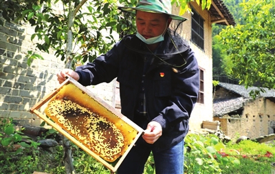 二組王必珍,今年70歲,是建檔立卡貧困戶。1990年右手截肢,靠養(yǎng)幾箱蜜蜂度生,并不斷投資蜂業(yè)。他介紹,養(yǎng)蜂是個(gè)好產(chǎn)業(yè),他雖然手不方便,但活兒不累。他與記者算起賬。他說(shuō),一個(gè)蜂箱有5個(gè)框,一個(gè)框搖糖1到1.5斤。一個(gè)箱一年搖糖3到4次,每斤糖按50元計(jì)算,20個(gè)箱就是2萬(wàn)多元。深山無(wú)污染,一年四季有蜜源,九月黃、牛藤、勾藤、芙蓉花等,就是冬天,也有柃木開花。