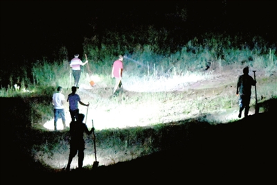 22:43分。在長江赤壁干堤11號(hào)哨所責(zé)任堤段,七束燈光在護(hù)堤林中閃耀。