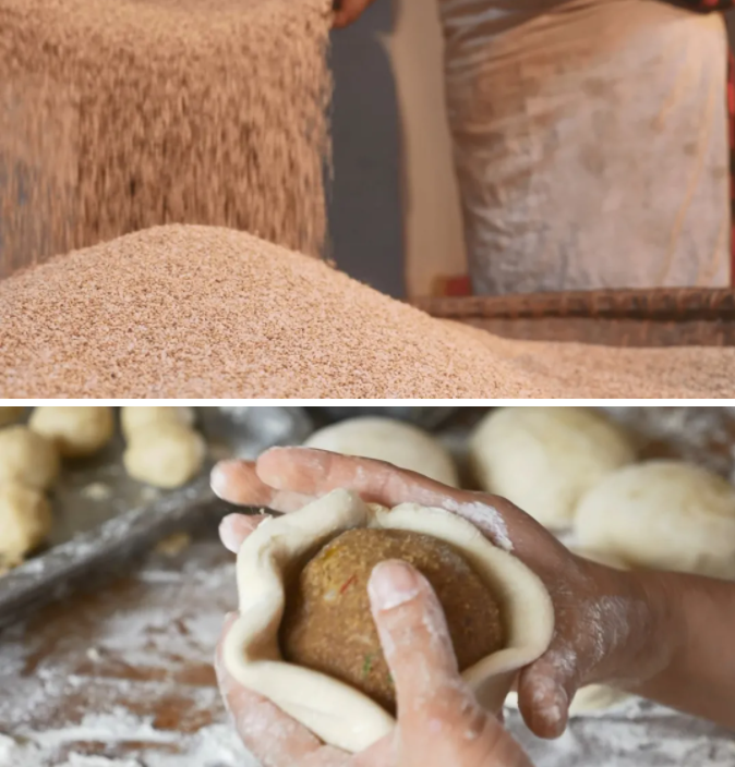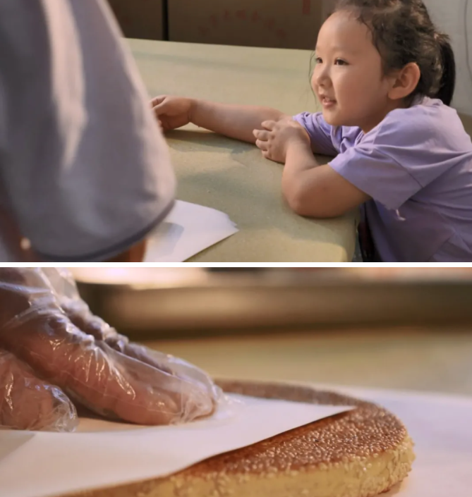 麻餅在制作前,先要炒好芝麻,炒好的芝麻倒進竹匾,其香味隔著鏡頭似乎都能聞得到。用各色干果仁、加上冰糖、陳皮、金錢桔等,十幾種食料破碎攪拌而成的餡料被搓好了,面團也被分成適量的面劑,再將搓好的餡料包進去,在鐵箍模具中,用木柄敲打延展和切削定型。