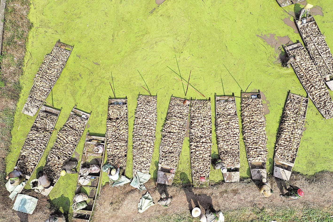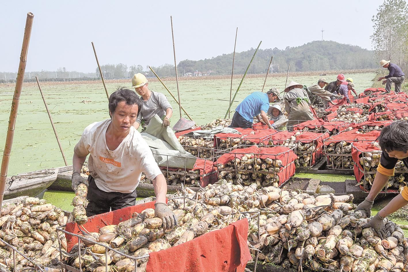 10月13日,嘉魚(yú)縣陸溪鎮(zhèn)農(nóng)民趁著晴好天氣挖藕。這些蓮藕經(jīng)嘉魚(yú)鴻富農(nóng)產(chǎn)品有限公司加工后,將出口至東南亞和北美等地區(qū)。嘉魚(yú)縣蓮藕、蓮子、藕帶是區(qū)域特色明顯的優(yōu)勢(shì)農(nóng)產(chǎn)品。近年來(lái),嘉魚(yú)縣把發(fā)展蓮藕作為調(diào)整農(nóng)業(yè)產(chǎn)業(yè)結(jié)構(gòu)、增加農(nóng)民收入的重要途徑。目前,全縣蓮藕種植面積4.85萬(wàn)畝,2019年全縣蓮藕產(chǎn)業(yè)實(shí)現(xiàn)綜合產(chǎn)值5.6億元。
