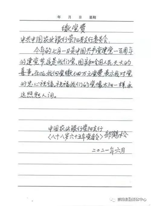 廖海峰告訴記者,來(lái)之前,鄒鶴松老人特意向中國(guó)農(nóng)業(yè)銀行崇陽(yáng)支行黨委寫了一封信,信里這樣寫著:“今年是中國(guó)共產(chǎn)黨建黨100周年,這是我們黨、國(guó)家和全國(guó)人民天大的喜事。在此,我向黨繳納4萬(wàn)元黨費(fèi),表示我對(duì)黨的衷心祝福。祝福我們的黨像太陽(yáng)一樣,永遠(yuǎn)照耀人間?!币痪渚浜?jiǎn)單樸實(shí)的語(yǔ)言,彰顯著一名老黨員赤心向黨、一心為黨樸實(shí)而偉大的情懷。