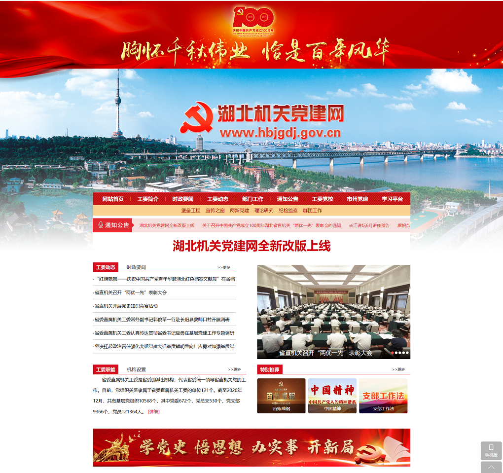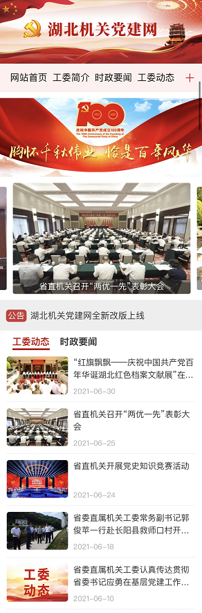 荊楚網(wǎng)(湖北日?qǐng)?bào)網(wǎng))訊(記者謝頤 通訊員鄭羽嬋)在中國共產(chǎn)黨成立100周年之際,湖北機(jī)關(guān)黨建門戶網(wǎng)站湖北機(jī)關(guān)黨建網(wǎng)(http://www.hbjgdj.gov.cn/)電腦端、移動(dòng)端全新改版上線。這是省委直屬機(jī)關(guān)工委積極探索智慧黨建的有效途徑,是加強(qiáng)省直機(jī)關(guān)黨建宣傳工作的重要舉措,是為黨慶生、為黨祝福獻(xiàn)上的特殊禮物。