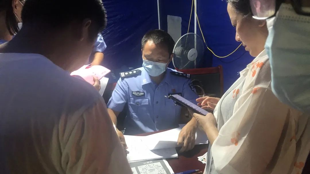 8月6日中午,氣溫近40攝氏度,熱風(fēng)滾燙。馬橋派出所民警雷剛早已汗流浹背,這是他和戰(zhàn)友當(dāng)天執(zhí)勤的第5個(gè)小時(shí)。截停車輛,測(cè)量體溫,登記錄入……雷剛不停重復(fù)著,被口罩和護(hù)目鏡遮得嚴(yán)實(shí)的臉龐,在太陽(yáng)的燒灼中透著深褐,與頭頂?shù)陌咨弊有纬煞置鞯姆床睢?/p>