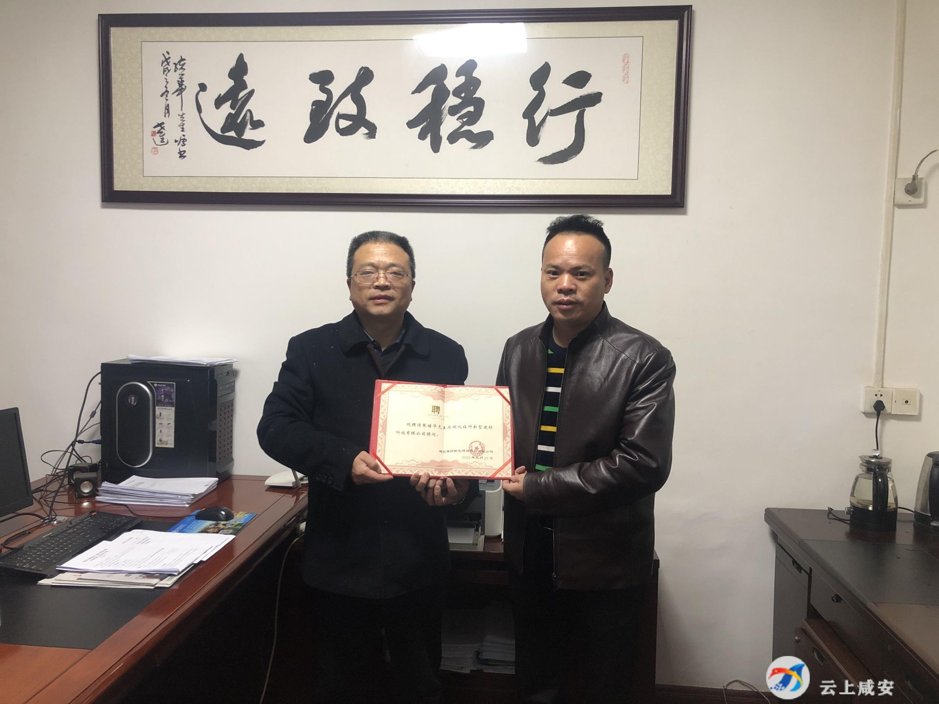 云上咸安報道(融媒體記者 劉正杰 李宇 特約記者 李星)日前,湖北福帥新型建材科技有限公司董事長吳選勤帶著公司的聘任證書,來到區(qū)科經(jīng)局,聘請該局局長張緒華為公司顧問。這張沒有報酬的聘書背后,是一份沉甸甸的責任,是科經(jīng)局有呼必應、應必有果的“店小二”精神,是區(qū)委、區(qū)政府不遺余力持續(xù)優(yōu)化營商環(huán)境的結(jié)果。