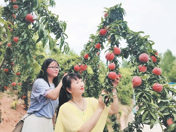 6月8日,游客在丹江口市均縣鎮(zhèn)均州蜜桃采摘園采摘蜜桃。眼下,正值蜜桃成熟期,該園吸引了不少游客前來(lái)采摘。據(jù)了解,2019年4月,原鄉(xiāng)人張慶華投資400多萬(wàn)元成立丹江口市億園果樹(shù)種植專(zhuān)業(yè)合作社,在當(dāng)?shù)亓鬓D(zhuǎn)200余畝荒地種植蜜桃,今年可采摘蜜桃25萬(wàn)公斤,收入200余萬(wàn)元,帶動(dòng)70余名農(nóng)戶(hù)平均增收6000元。記者李平攝