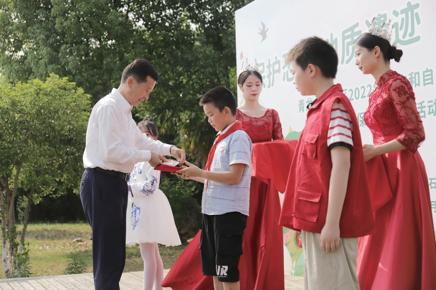 湖北青龍山恐龍蛋化石群國家級自然保護區(qū)管理局局長、黨組書記姚天國為獲獎學生頒獎。