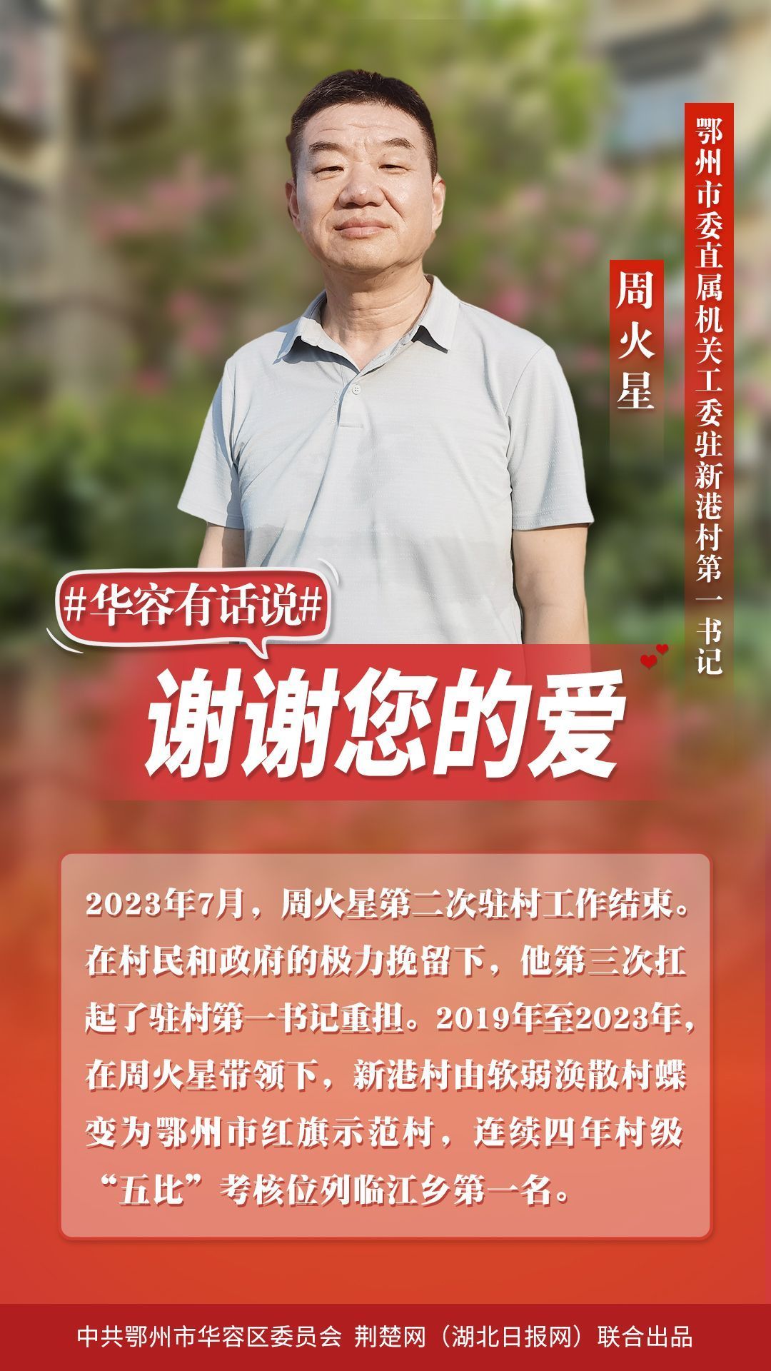 華容無所有,聊贈一顆心。千恩萬謝,訴不盡離別衷腸;千言萬語,道不盡感激之情。20多萬華容百姓捎來心里話:“繼續(xù)駐村同志,攜手并肩前行;駐村結(jié)束返崗?fù)?,?;丶铱纯矗A容是您的第二故鄉(xiāng),是您永遠(yuǎn)的家!”