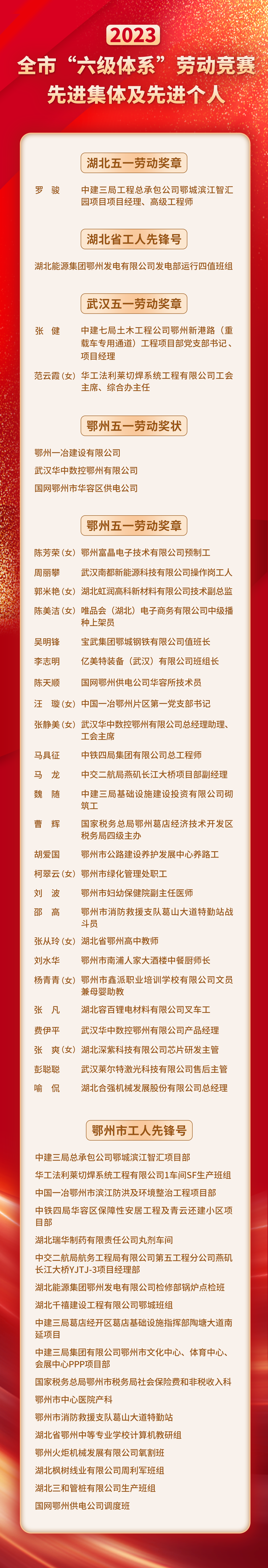 4月22日上午,在2024年鄂州市雙“百千萬”勞動(dòng)和技能競(jìng)賽啟動(dòng)式上,鄂州公布2023年全市“六級(jí)體系”勞動(dòng)競(jìng)賽先進(jìn)集體及先進(jìn)個(gè)人名單,并公布2023年鄂州市職工(勞模、工匠)創(chuàng)新工作室和產(chǎn)業(yè)工人培訓(xùn)基地。