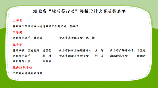 活動(dòng)期間,現(xiàn)場(chǎng)還公布了黃石市參加2024年湖北省“綠書簽行動(dòng)”海報(bào)設(shè)計(jì)大賽優(yōu)秀作品、優(yōu)秀組織單位,并為獲獎(jiǎng)單位和代表進(jìn)行頒獎(jiǎng)。