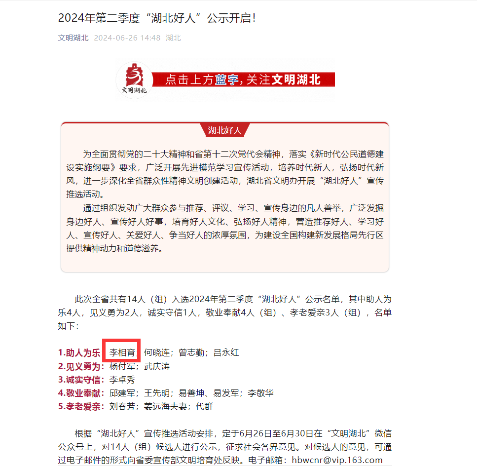 荊楚網(wǎng)(湖北日報網(wǎng))訊(記者呂鑒蕾 通訊員華文莉)6月26日,2024年第二季度“湖北好人”名單集中公示,全省共有14人(組)上榜。其中,黃石開發(fā)區(qū)·鐵山區(qū)汪仁鎮(zhèn)磊山村村民李相育榜上有名。