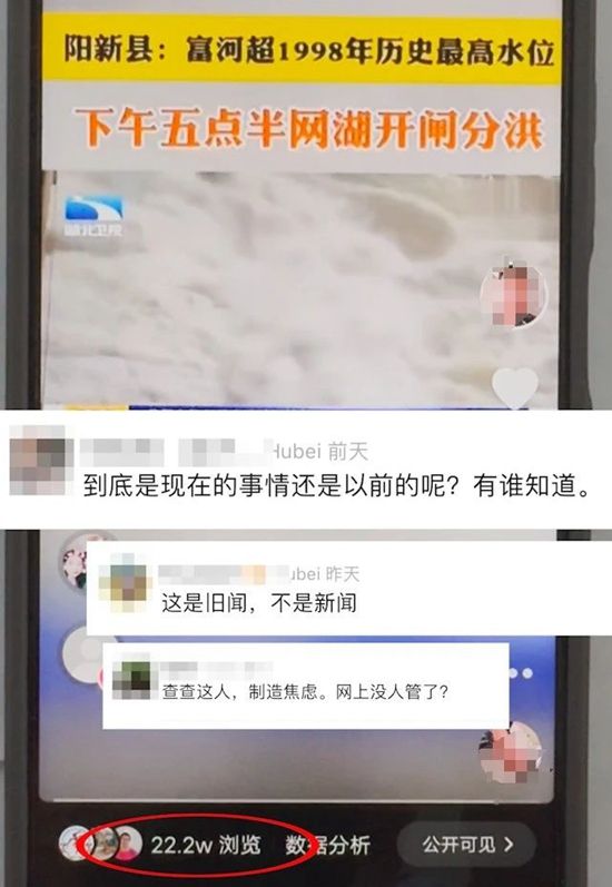 該視頻一經(jīng)發(fā)布,立即引起了廣大網(wǎng)民的關注和擔憂,誤導網(wǎng)民認為發(fā)生了洪災險情。相關視頻發(fā)布后瀏覽量達22.2萬人次,在一定程度上引發(fā)了公眾恐慌。