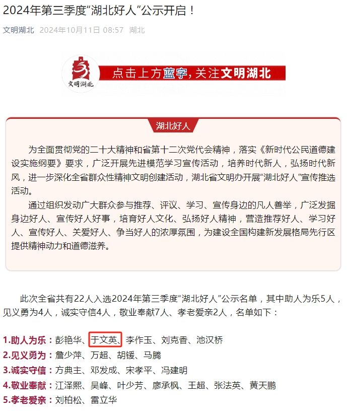 荊楚網(湖北日報網)訊(記者呂鑒蕾 通訊員黃旺宣、華文莉)10月11日,2024年第三季度“湖北好人”公示開啟,全省共有22人入選公示名單。其中,“鑰匙姑娘”于文英榜上有名。