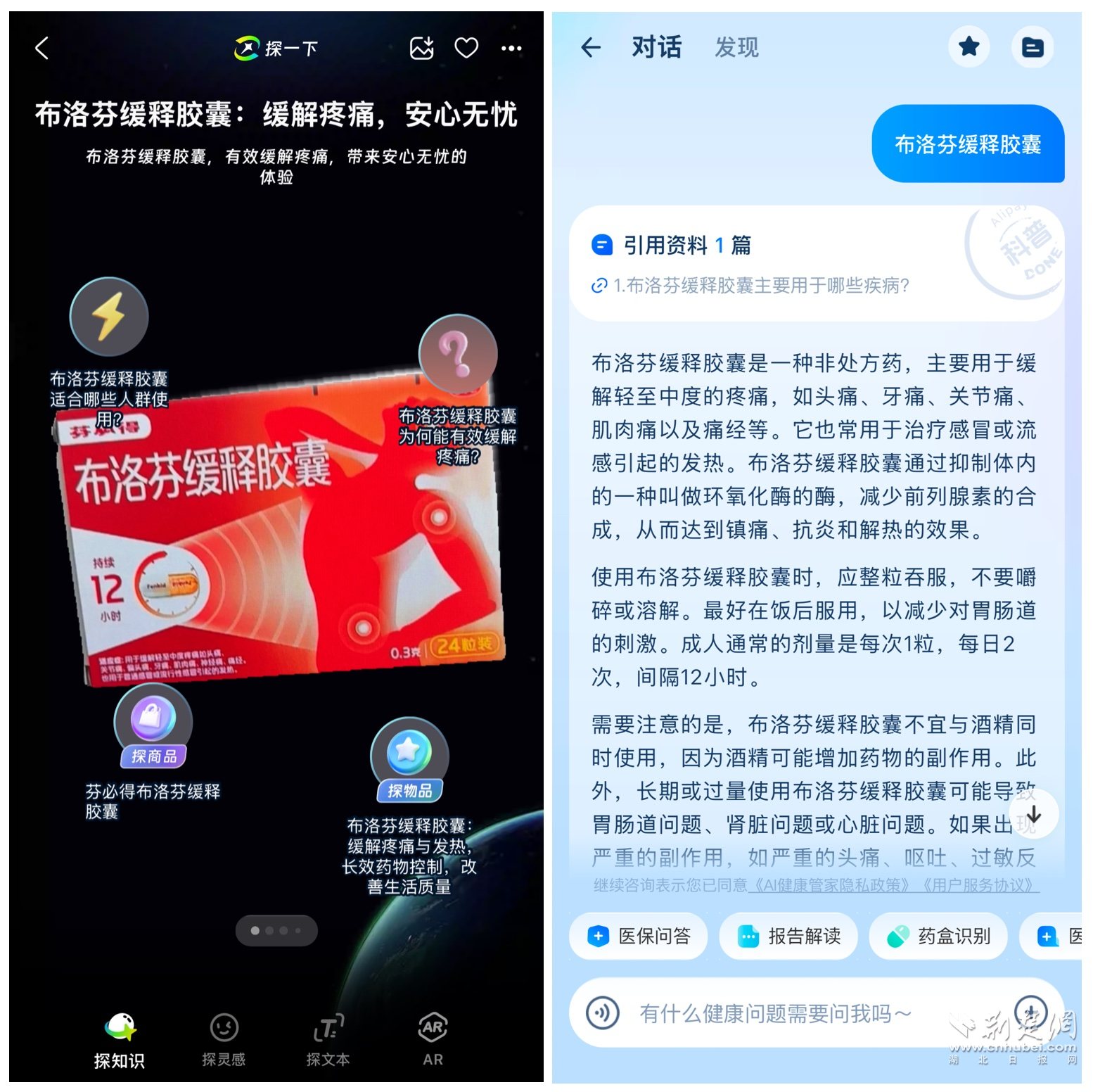 遇到讀不懂的外文商品,探一下就能獲取詳情,更方便線上買同款;家里丟了說明書的藥盒,不僅可查到詳細介紹,還能調用支付寶旗下“AI健康管家”追問更多的用藥須知。