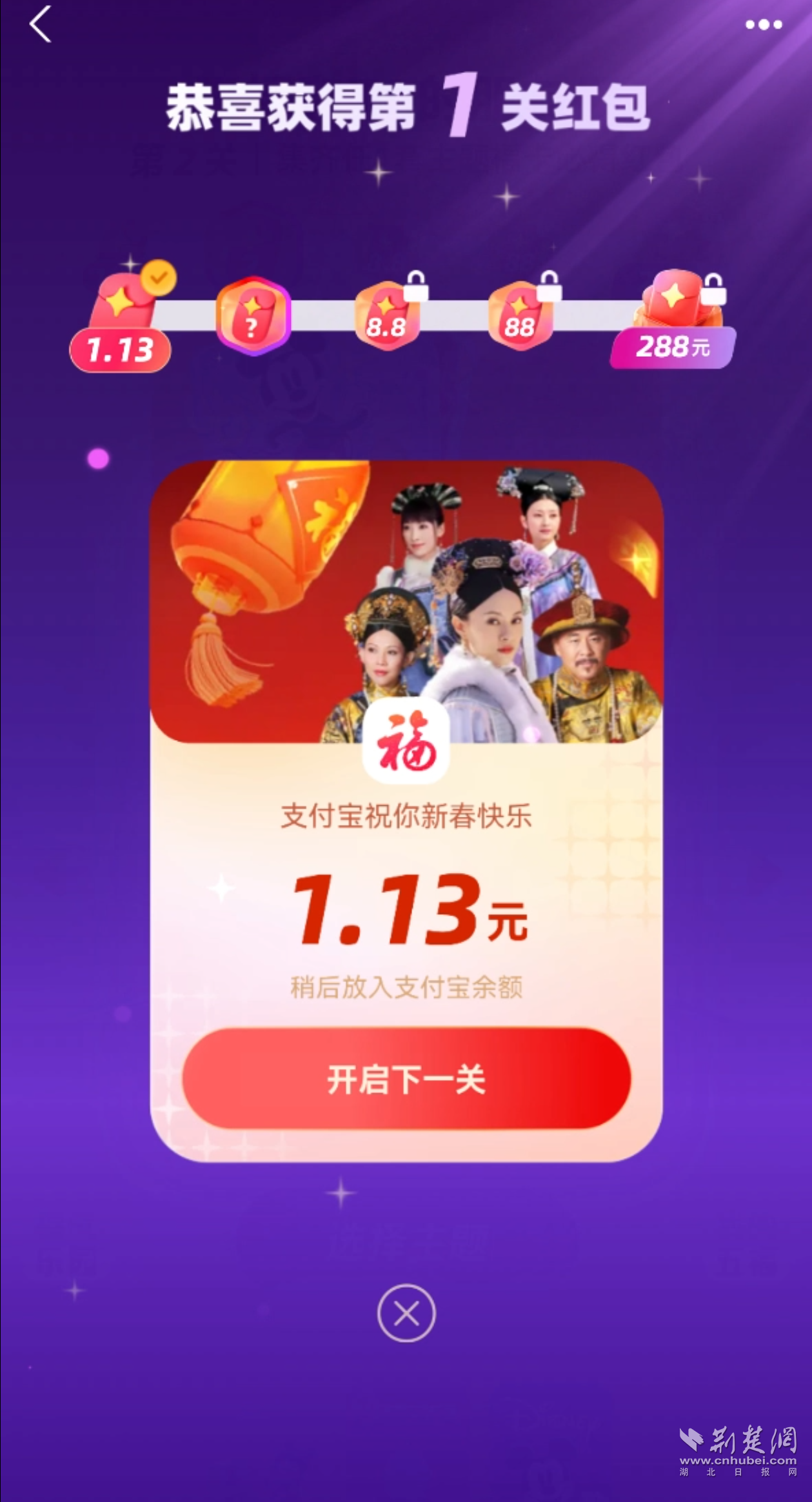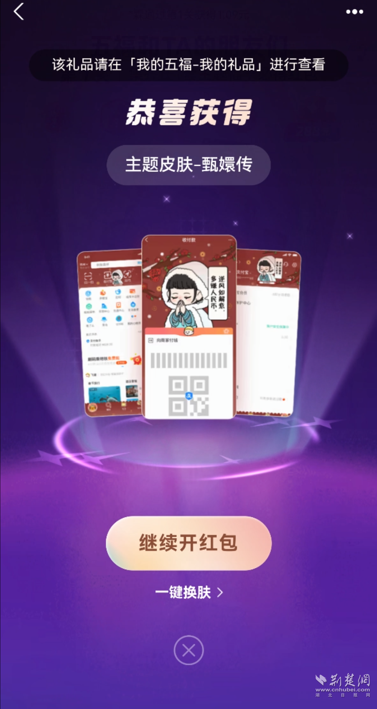 記者大約掃了六七次,就輕松集齊4張卡,合成后獲得了“甄嬛傳”主題的支付寶app的皮膚,領(lǐng)取紅包“開啟下一關(guān)”,則可以繼續(xù)闖關(guān)合成開獎(jiǎng)。開獎(jiǎng)不用等到除夕,并且可以一直集福到大年初五,這也是今年集福最大的變化之一。