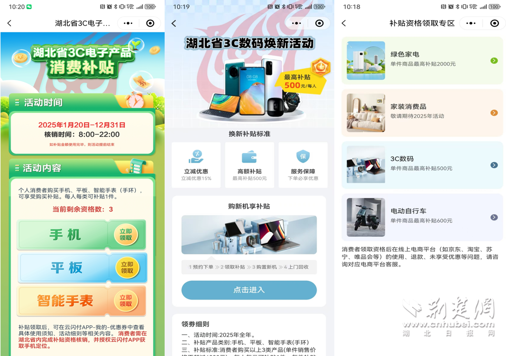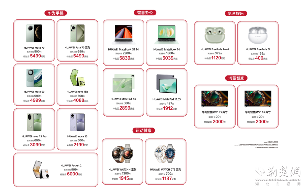 荊楚網(wǎng)(湖北日?qǐng)?bào)網(wǎng))訊 (通訊員 高洋)2025年1月20日,“國(guó)補(bǔ)”政策首次擴(kuò)圍至消費(fèi)電子行業(yè)。對(duì)個(gè)人消費(fèi)者購(gòu)買(mǎi)華為手機(jī)、平板、智能手表手環(huán)等3類數(shù)碼產(chǎn)品(單件銷(xiāo)售價(jià)格不超過(guò)6000元),按產(chǎn)品銷(xiāo)售價(jià)格的15%給予補(bǔ)貼,每位消費(fèi)者每類產(chǎn)品可補(bǔ)貼1件,每件補(bǔ)貼不超過(guò)500元。對(duì)于想要購(gòu)買(mǎi)華為手機(jī)的消費(fèi)者來(lái)說(shuō),這波優(yōu)惠力度拉滿。