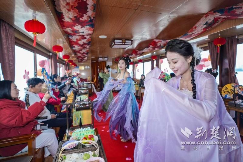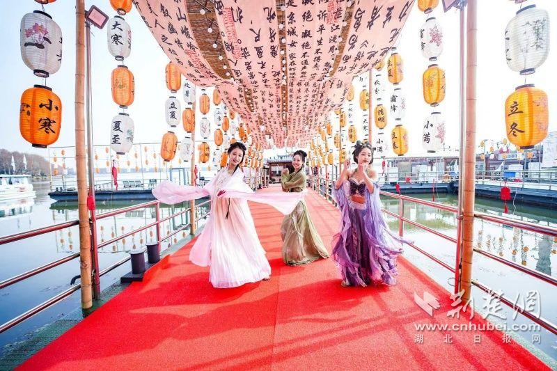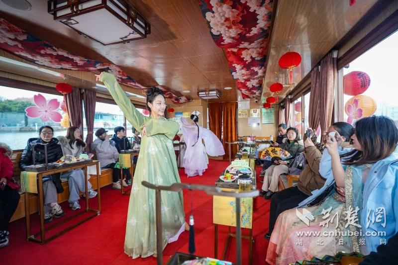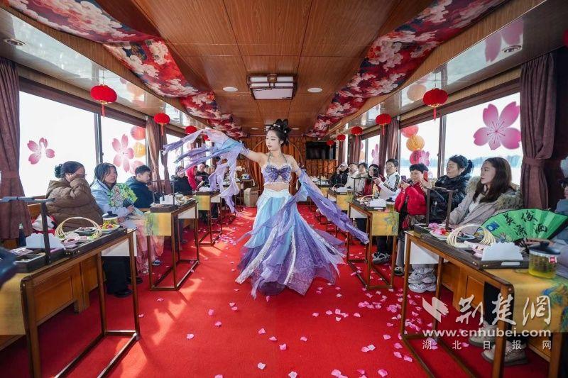 據(jù)介紹,全新上線的精品環(huán)湖游將為游客帶來(lái)沉浸式國(guó)風(fēng)演藝體驗(yàn),從楚風(fēng)園碼頭出發(fā),在游客登船之際,精彩好戲就已正式開(kāi)鑼。畫(huà)舫離岸,演出開(kāi)始,《元夕》《一面驚鴻》《錦瑟》等國(guó)風(fēng)舞蹈亮相甲板,表演者們霓裳蹁躚,或婉約柔美,或英氣颯爽,在游客面前隨著悠揚(yáng)楚樂(lè),將楚舞的神韻演繹得絲絲入扣,不時(shí)還與游客隨機(jī)互動(dòng),同賀新春。