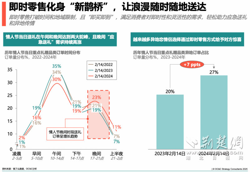 荊楚網(wǎng)(湖北日?qǐng)?bào)網(wǎng))訊(通訊員 易曄)元宵才過(guò),情人節(jié)接檔。零售品牌商戶們毫不猶豫步入下一個(gè)生意高峰,過(guò)節(jié)的愛(ài)人們也不慌不忙在節(jié)日當(dāng)天開(kāi)始籌備浪漫表達(dá)。近日,餓了么聯(lián)合戰(zhàn)略咨詢公司OC&C共同發(fā)布的《情人節(jié)即時(shí)零售禮贈(zèng)趨勢(shì)與品類機(jī)遇洞察》顯示,過(guò)去三年情人節(jié)當(dāng)天,重點(diǎn)禮贈(zèng)品類的外賣單量較12日環(huán)比增長(zhǎng)超過(guò)3倍,且當(dāng)日送禮訂單在晚間(17-21點(diǎn))需求持續(xù)增長(zhǎng)。