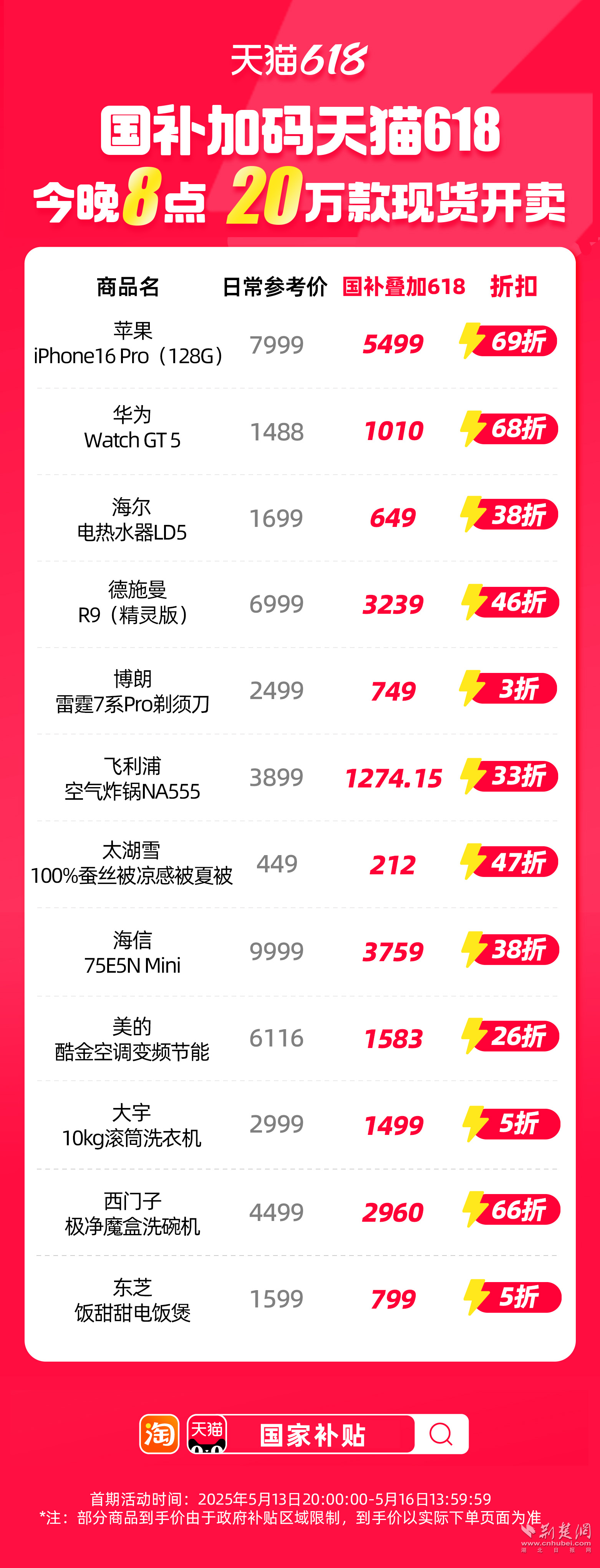 荊楚網(wǎng)(湖北日?qǐng)?bào)網(wǎng))訊(通訊員 朱飛)天貓618重磅加碼國(guó)補(bǔ),家電、家裝、家居、3C數(shù)碼等品類將低至5折,今晚8點(diǎn),現(xiàn)貨開(kāi)賣。